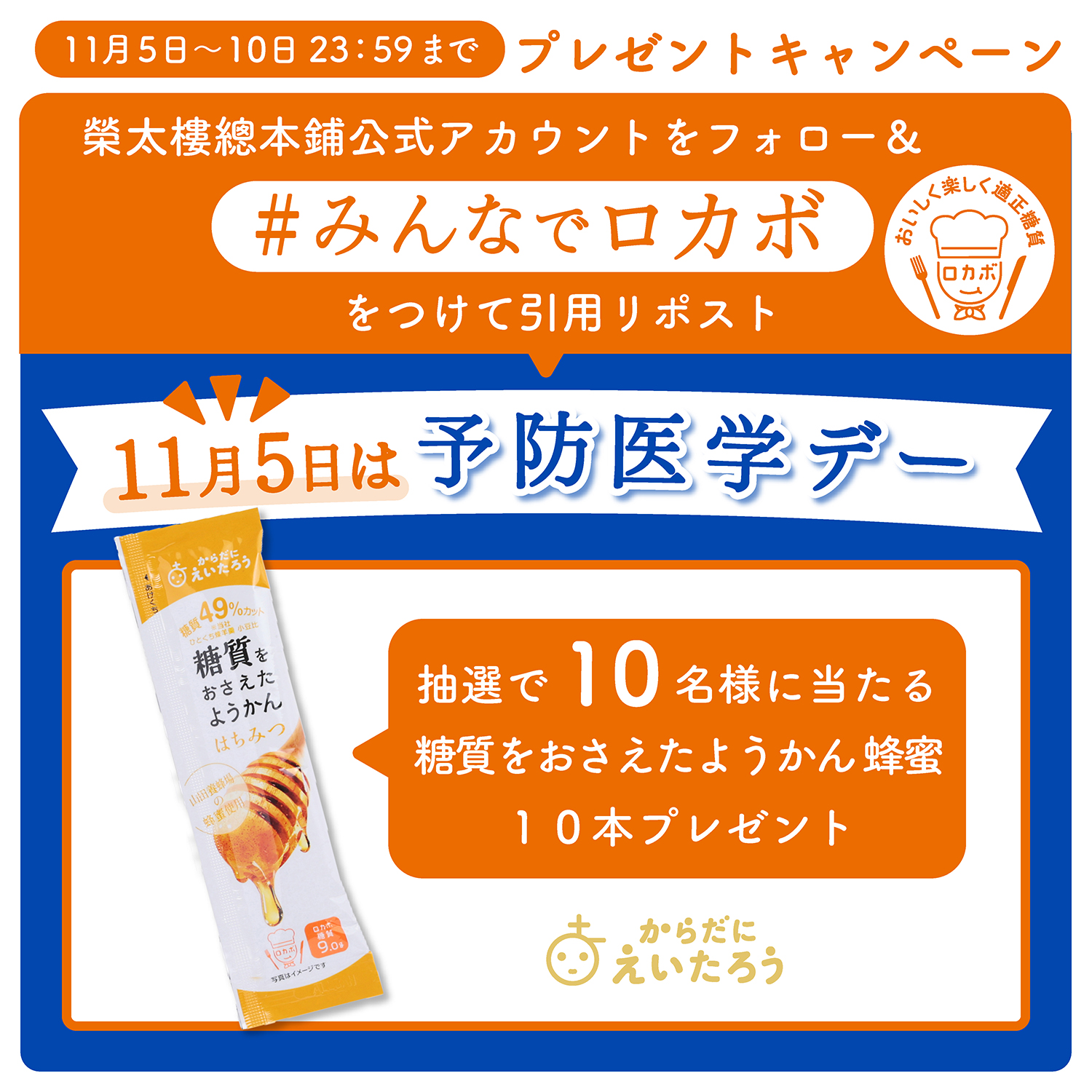 榮太樓總本鋪 公式Xにて11/5予防医学デーを記念して『糖質をおさえたようかん はちみつ』のプレゼントキャンペーンを開催いたします。