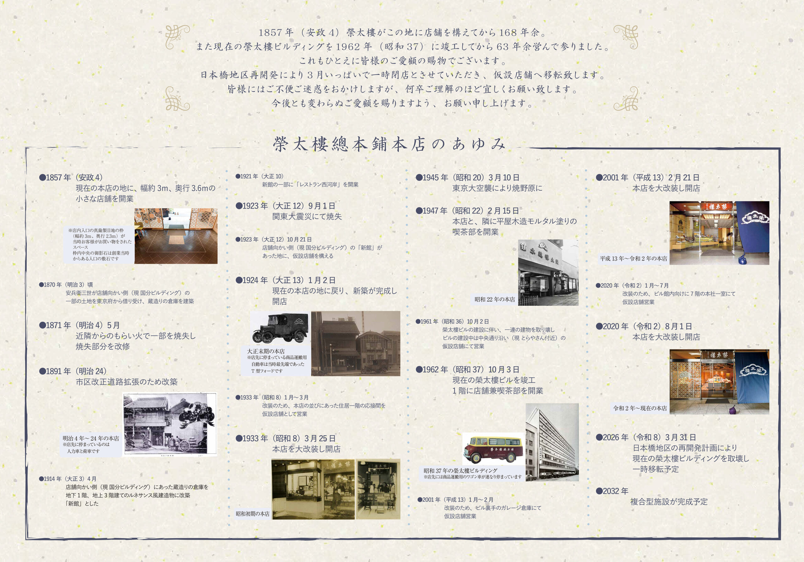 1857年(安政4)榮太樓がこの地に店舗を構えてから168年余。また1962年(昭和37)に現在の榮太樓ビルディングを竣工してから63年余営んで参りました。これもひとえに皆様のご愛顧の賜物でございます。この度、日本橋地区の再開発に向けて3月いっぱいで一時閉店とさせていただき、仮店舗へ移転することとなりました。仮店舗は日本橋駅よりさらに近い場所となりますので、ぜひお気軽にお立ち寄りくださいますようお願い申し上げます。仮店舗の開店日につきましては、詳細が確定次第改めてお知らせ致します。皆様にはご不便ご迷惑をおかけしますが、何卒ご理解のほど宜しくお願い致します。今後とも変わらぬご愛顧を賜りますよう、お願い申し上げます。