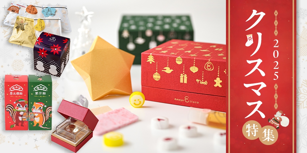 榮太樓公式オンラインストアでは、今年も『クリスマス特集』を公開いたしました。ブリリアントカットの輝きをモチーフに誕生した「スイートダイヤモンド」や、板あめやスイートリップを限定パッケージ詰め合わせた「Twinkle Box」、飴が12粒入った「ちさリスクリスマス」など、聖夜を彩る季節限定商品を様々ご用意しております。大切な方への贈り物にいかがでしょうか。是非ご覧ください。
