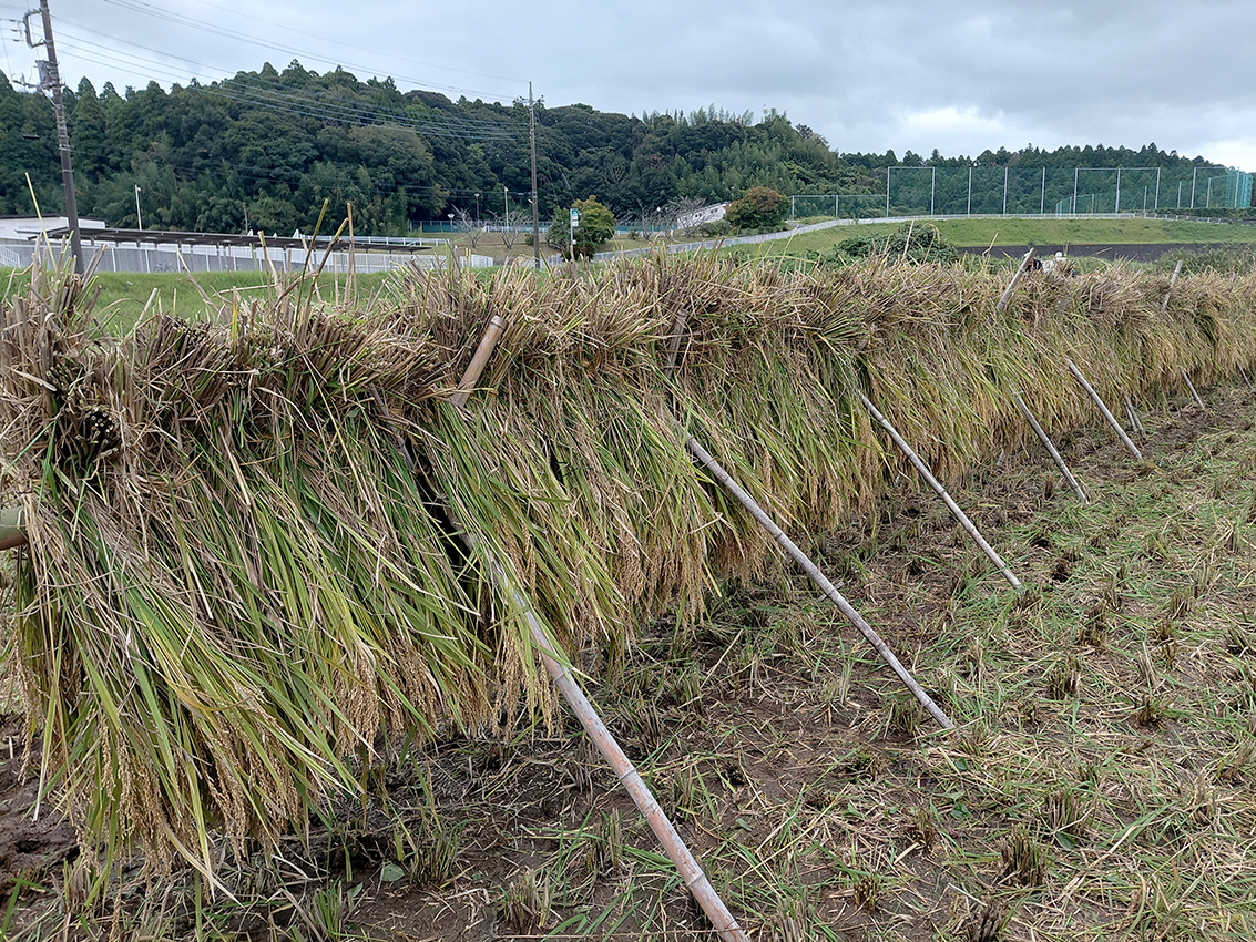▶丁寧に束ねた稲を竹で作った木組みに並べて干していきます。
