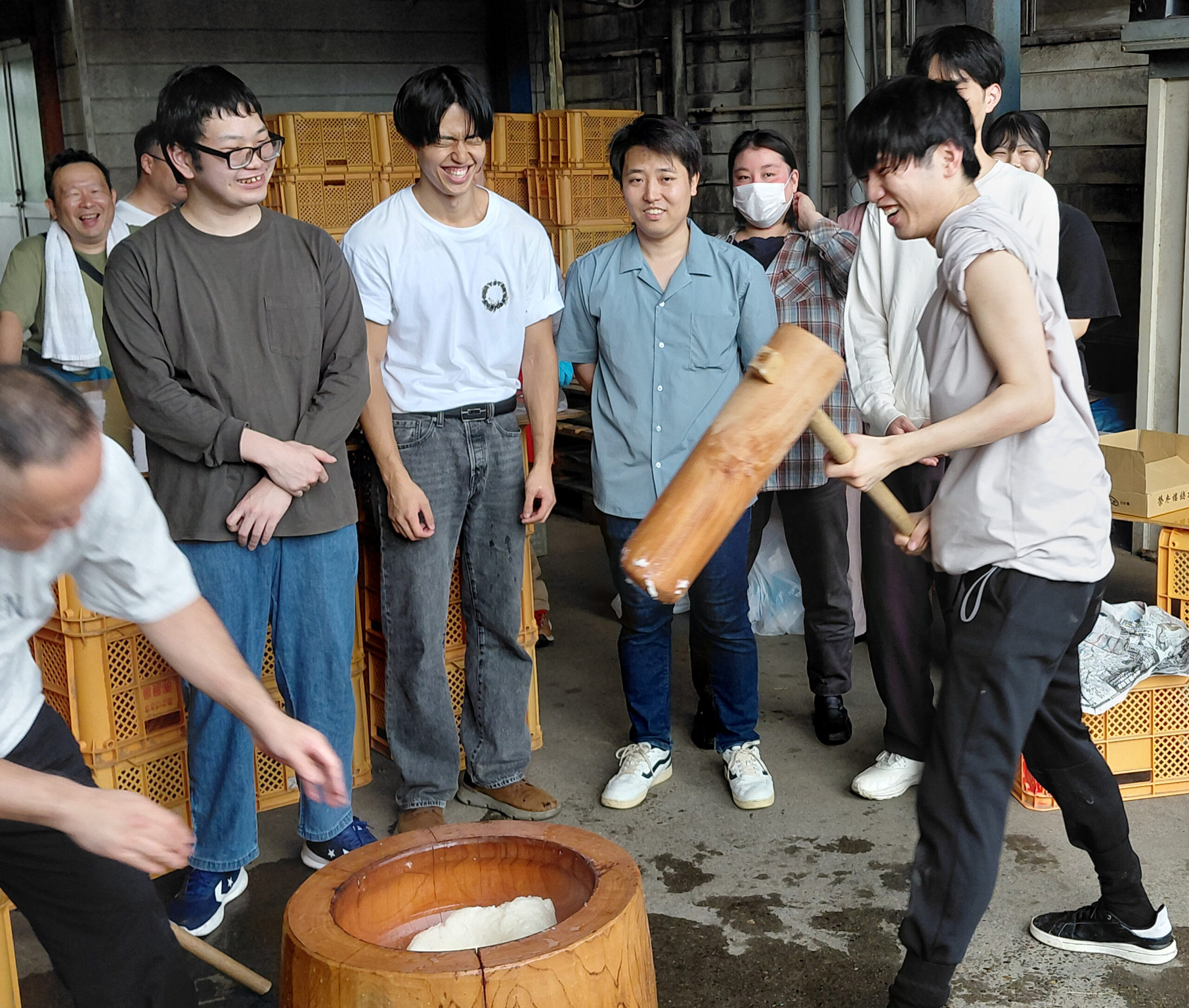 ▶一足先に収獲したマンゲツモチを使い、参加者で餅つきを行いました。笑顔あふれる締めくくりとなりました。