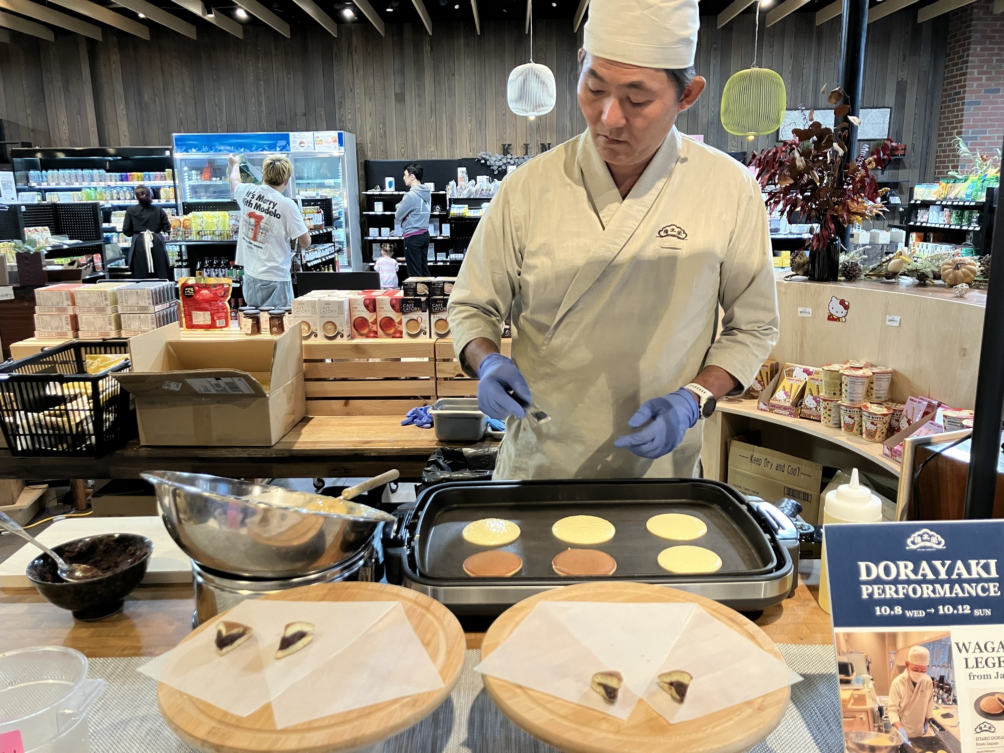 話し合いを重ねる中で、現地でも比較的親しみやすい「どらやき」を売ろうという話になりました。「せっかくなら、ただ並べて売るだけでは面白くない、現地で実演パフォーマンスをしよう」と、副社長の細田真也自らが決意。限られた期間の中、ひと夏で製造技術を習得し、昨年秋に初の実演パフォーマンスを披露。日本橋どらやきは期間中完売し、抹茶イベントとともに好評を博しました。
