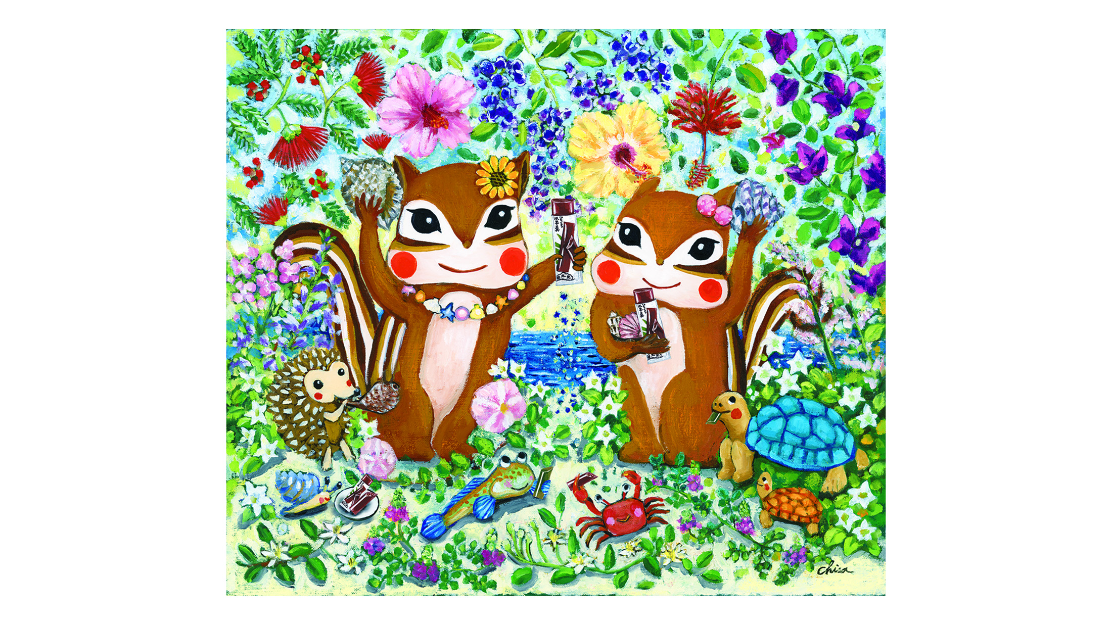 「南の国の花が風に揺れる海辺で、リスたちがカメの親子やムツゴロウなどゆかいな動物たちと一緒に遊びながら水羊羹を食べているようです。貝殻を耳に当てて海の音を聞いたり、手のひらからキラキラ落ちる星の砂を眺めたり… 穏やかな海を背景に花に囲まれて海辺で仲良くひとくち水羊羹を分け合う動物たちとともに素敵なひと時をお過ごしください。」